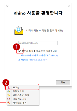 라이노8 설치 후 혹은 설치된 라이노에서 'LAON' 팀 라이센스에 초청된 라이노계정으로 로그인합니다.