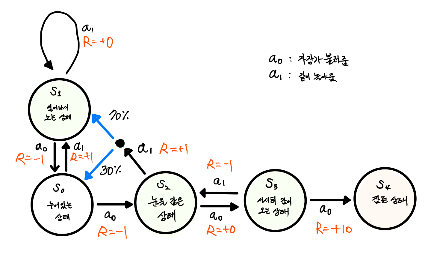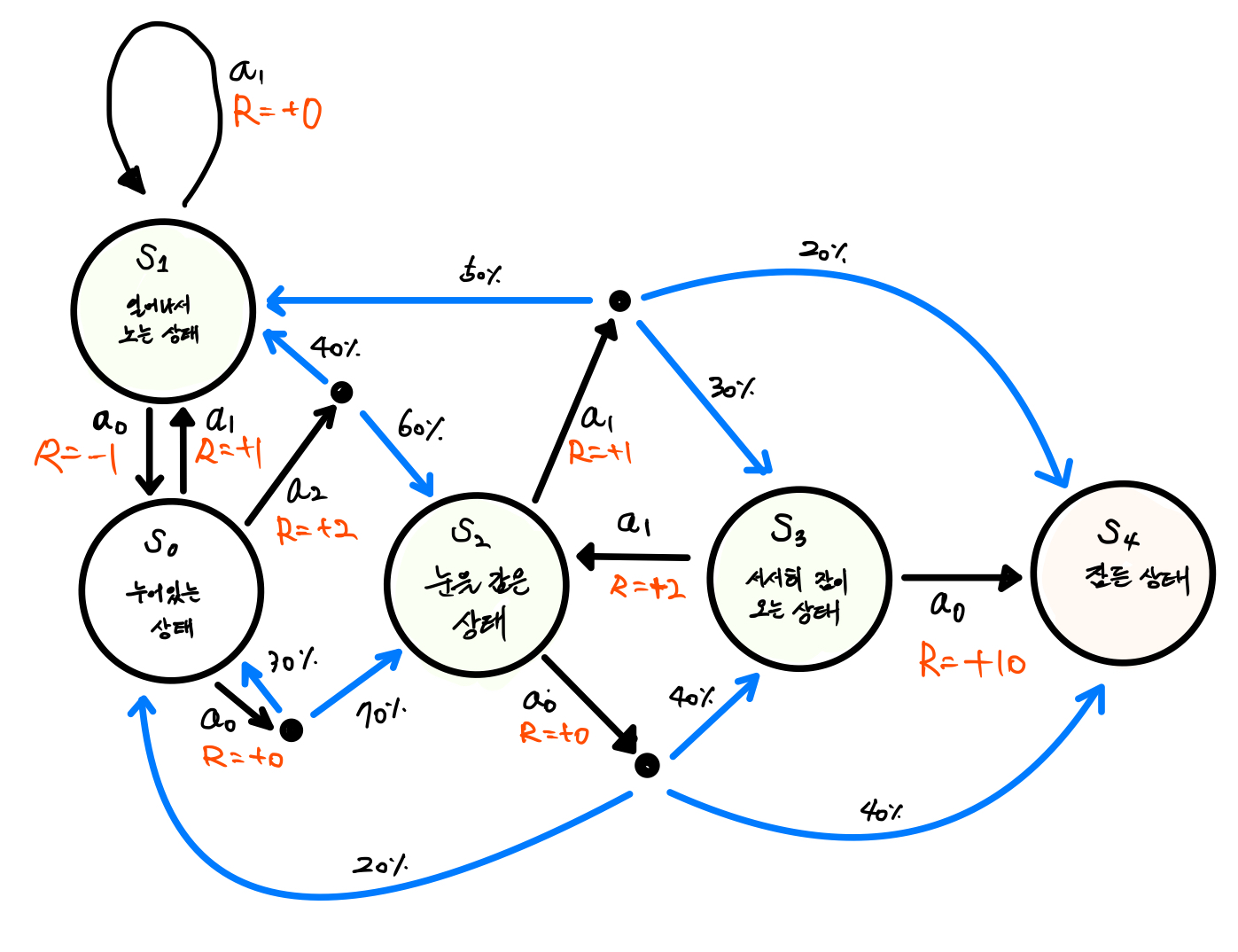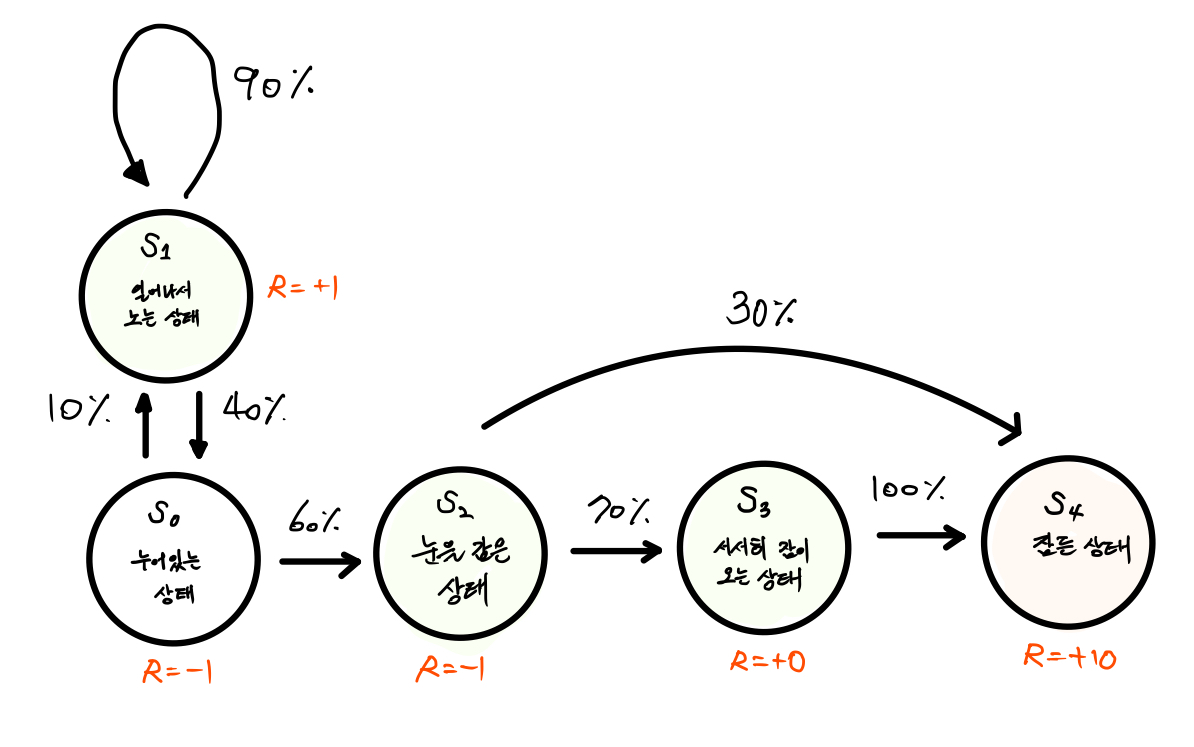 | 보다 복잡해진 아이 재우기 MDP 그림 |