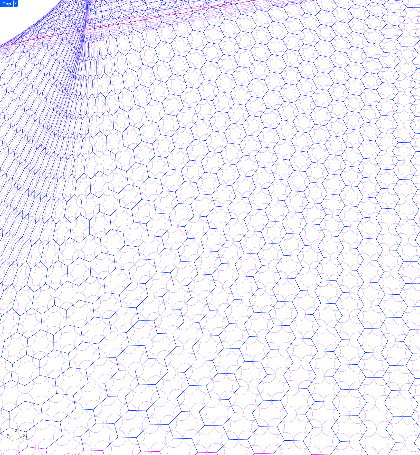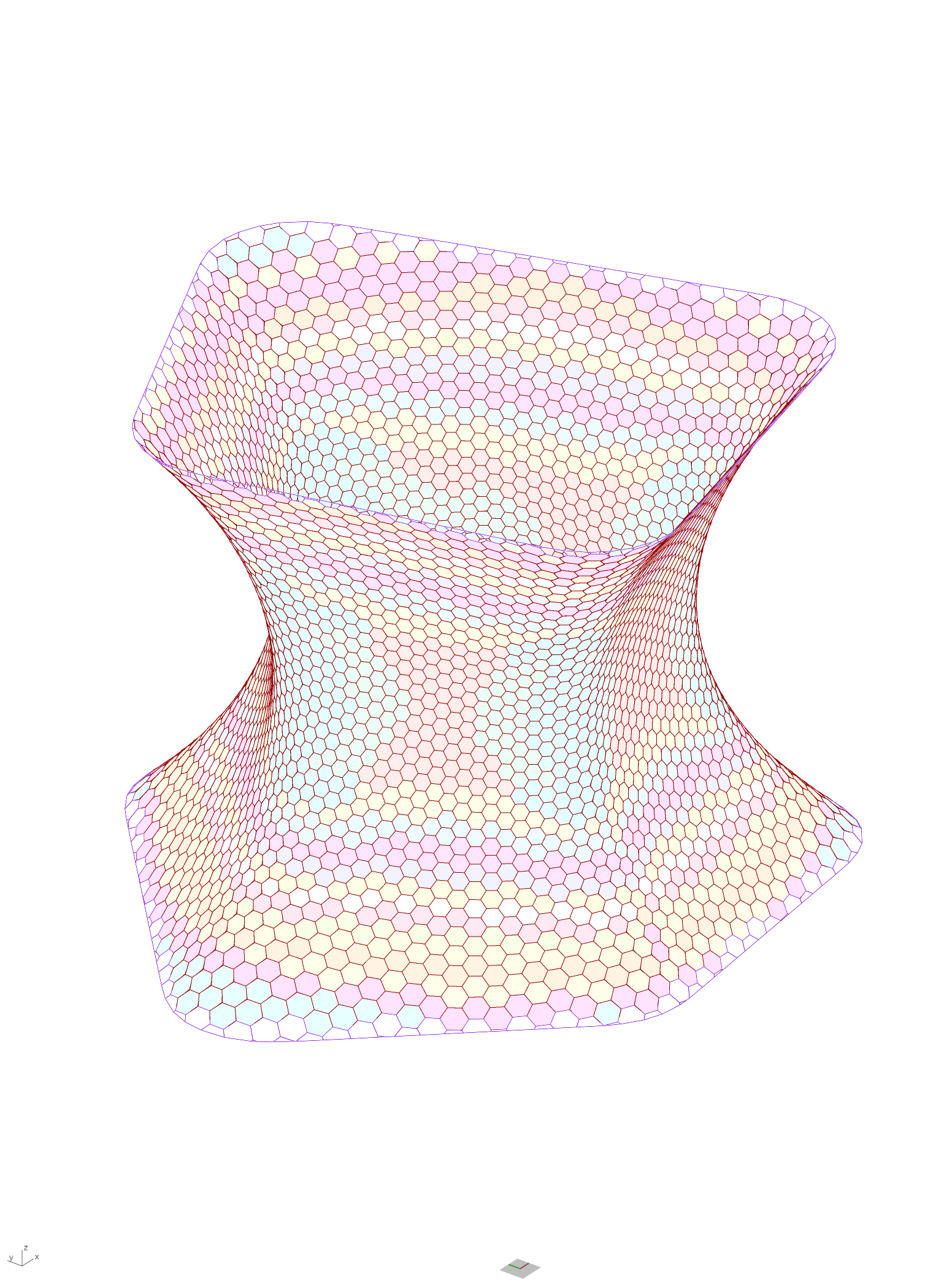 자연스러운 곡면 형태에 패널작업을 하기위해선 CP 메쉬 (Circle Packing Mesh: 각 면의 내접원이 패킹을 형성하는 새 로운 삼각형 메쉬)라는 방법을 사용하면 효과적으로 패널링 할 수 있습니다. 본 프로젝트는 이런 삼각형을 6개를 모아서 결 과적으로 육각형의 패널을 형성합니다.